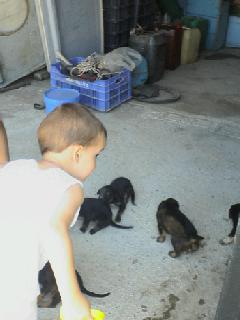 Manolis looking small puppies, Sitia, Crete, Greece, August 2004
